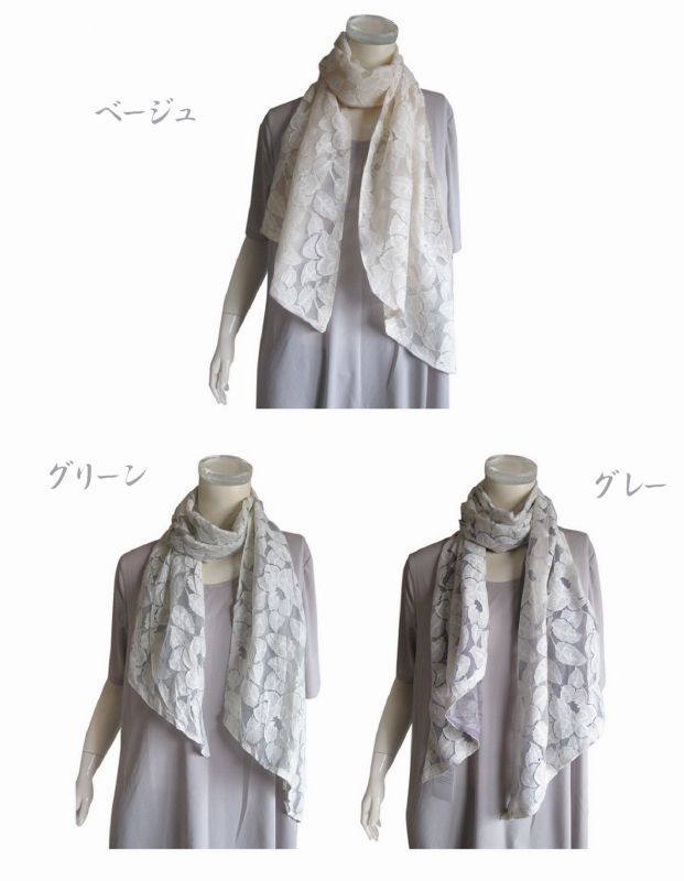 【薄手ストール】コットン100% 2枚重ねのフラワーレース ストール 3色(ベージュ/ グレー/ グリーン ) [181601] 二枚重ねの上質感溢れるストール♪ 柔らかなコットン素材のフラワーレース☆ 軽く柔らかな肌触りの、豪華なレースのストールです。 レース生地と薄く透ける生地との2枚重ねで、 リンクル加工も施されているのでふんわりと巻いていただけます。 程良いボリューム感で巻き易いのもおすすめポイントです♪ 色はベージュ、グレーにグリーンの3色。 コンパクトにバッグに入る軽くソフトな肌触りのストールです。 1枚プラスするだけでコーディネートの華やかなアクセントに♪ ◆ラッピング無料 コットン100% 2枚重ねのフラワーレース ストール♪サイズ 約29cm×160cm素材 綿(コットン)100%カラー ベージュ グレー グリーン生産地中国ブランド名tri for lium ストール一覧 ストール スカーフ マフラー コットン 綿 レース 花柄 保温 保湿 UV対策 日除け ギフト プレゼント 母の日 バースデー 誕生日 ホワイトデー ☆レース☆ 〜Lace Item〜 レースアイテム 身に着けると、たちまち優雅な大人のスタイルに♪