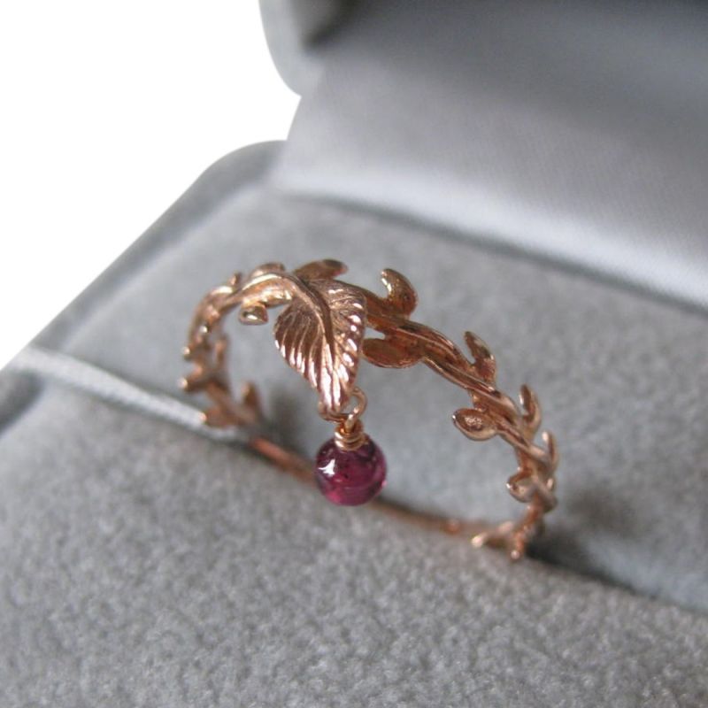 木の葉とガーネットの繊細なアンティーク調シルバーリング
