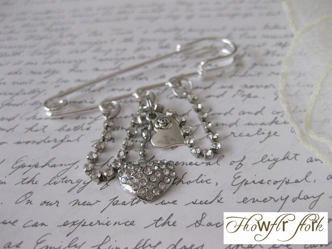 ◆flower storm◆ 異なる二つのハートとラインストーンチェーンのピンブローチ |