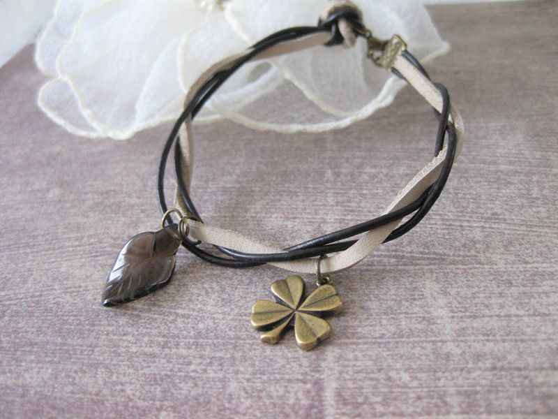 天然石スモーキークォーツの葉&四葉のクローバーの革紐ブレスレット