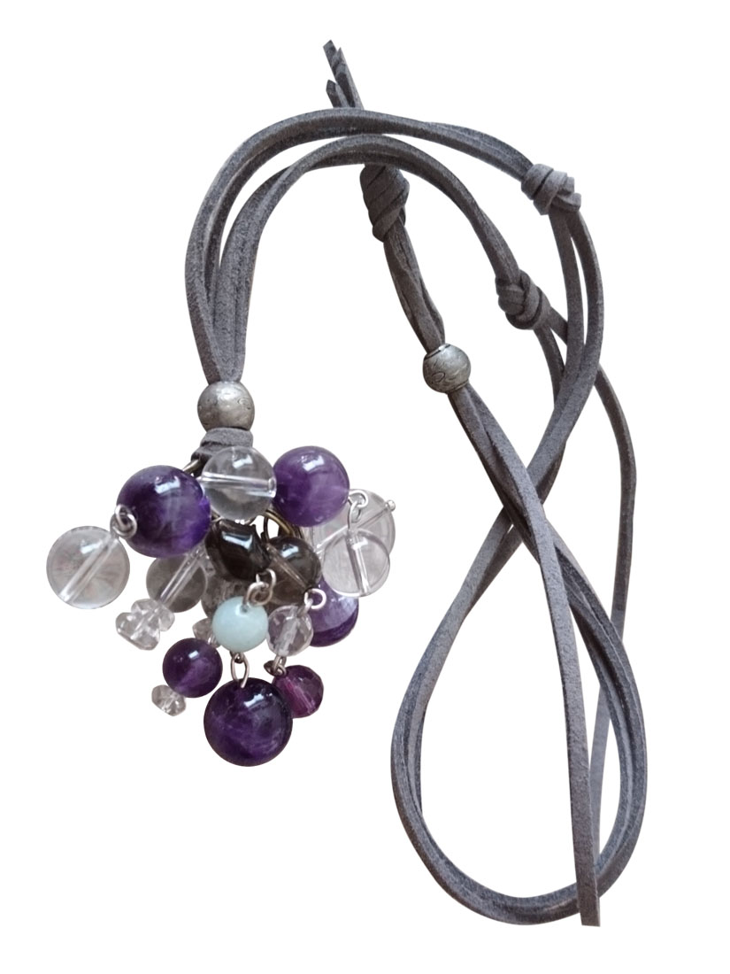 グレーの革紐に豪華な天然石のトップをさりげなく組み合わせ、