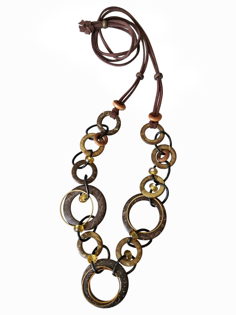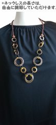ウッド&メタルのリングパーツを連ねたオータムカラー革紐ロングネックレス