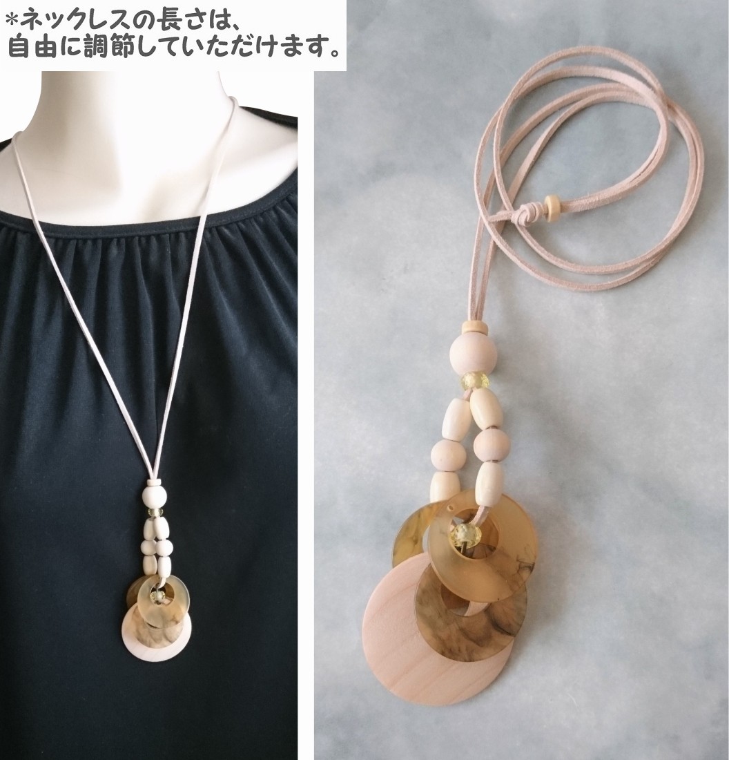 大小のウッドビーズで全体を引き締めたロングネックレス。