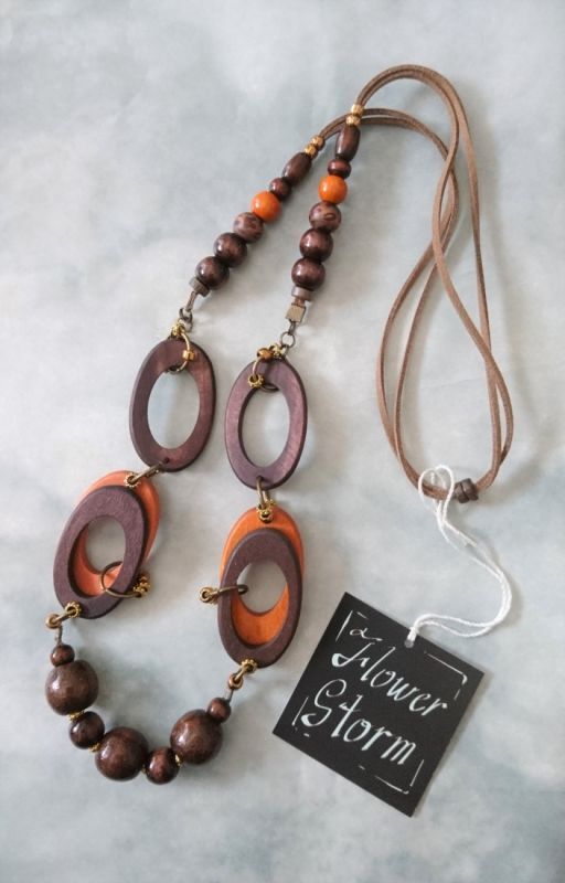 楕円形チャームやビーズの木製パーツを使用したロングネックレス。