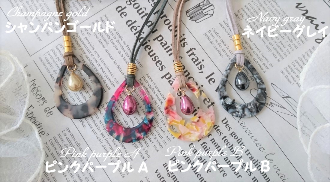 しずく型チャーム&カラーパールの革紐ロングネックレス
