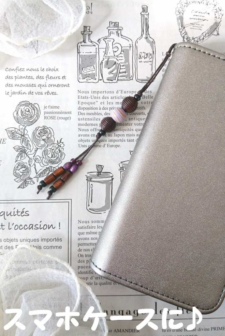 ウッドビーズとロウ引き紐で仕上げたストラップチャーム☆