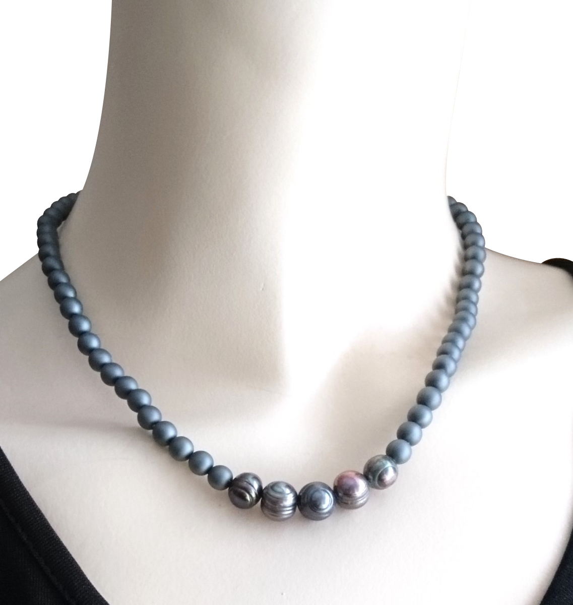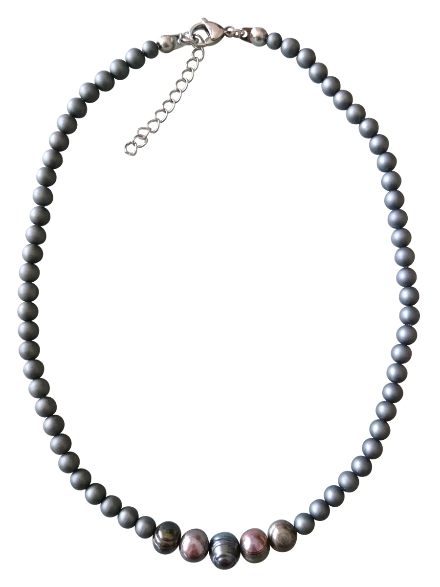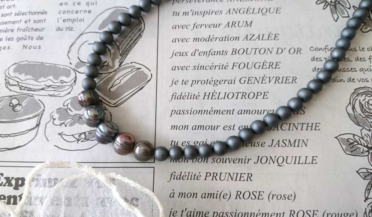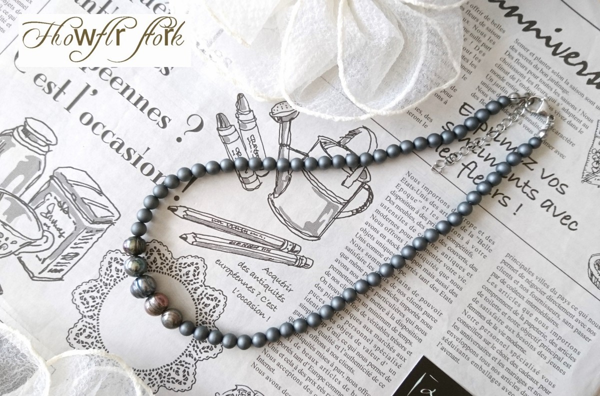 素材、質感の異なる2種の丸玉パールを使用したネックレスです。