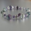 【パワーストーン】フローライト アメシスト 天然石ブレスレット★蛍石☆なんとも美しい石 フローライトとアメシストを使用した天然石ブレスレット。フローライト(和名:蛍石)の持つパワーは色彩によって変わると言われています。グリーン系は健康運アップに効果があるとされています。疲れた心や体を癒し、集中力を高める効果があるとされ、受験生や長時間仕事をしている人にぴったりです。パープル系は、頭脳の働きをクリアにし、冷静な分析力をもたらすと言われ、特にデータ解析と統合のような仕事をされている方にはぴったり。また、意識を日常の枠から解き放ち、宇宙意識を感じさせるともいいます。 【サイズ】フローライト:約10mm・8mm玉紫水晶:約4mm玉全長:約18cm 【素材】フローライト、アメシスト、金属金具【生産地】 日本※天然石ですので、もともとある内包物(キズのように見える)がある場合がございます。 画面の最初に戻る