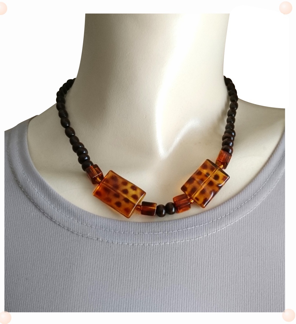 【送料無料】◆flower storm◆長さ42cm 琥珀色のアクリルビーズ&ウッドビーズのショートネックレス amber × brown 金属アレルギー対応 (アンバー ステンレス アクセサリー チョーカー 日本製 レディース)