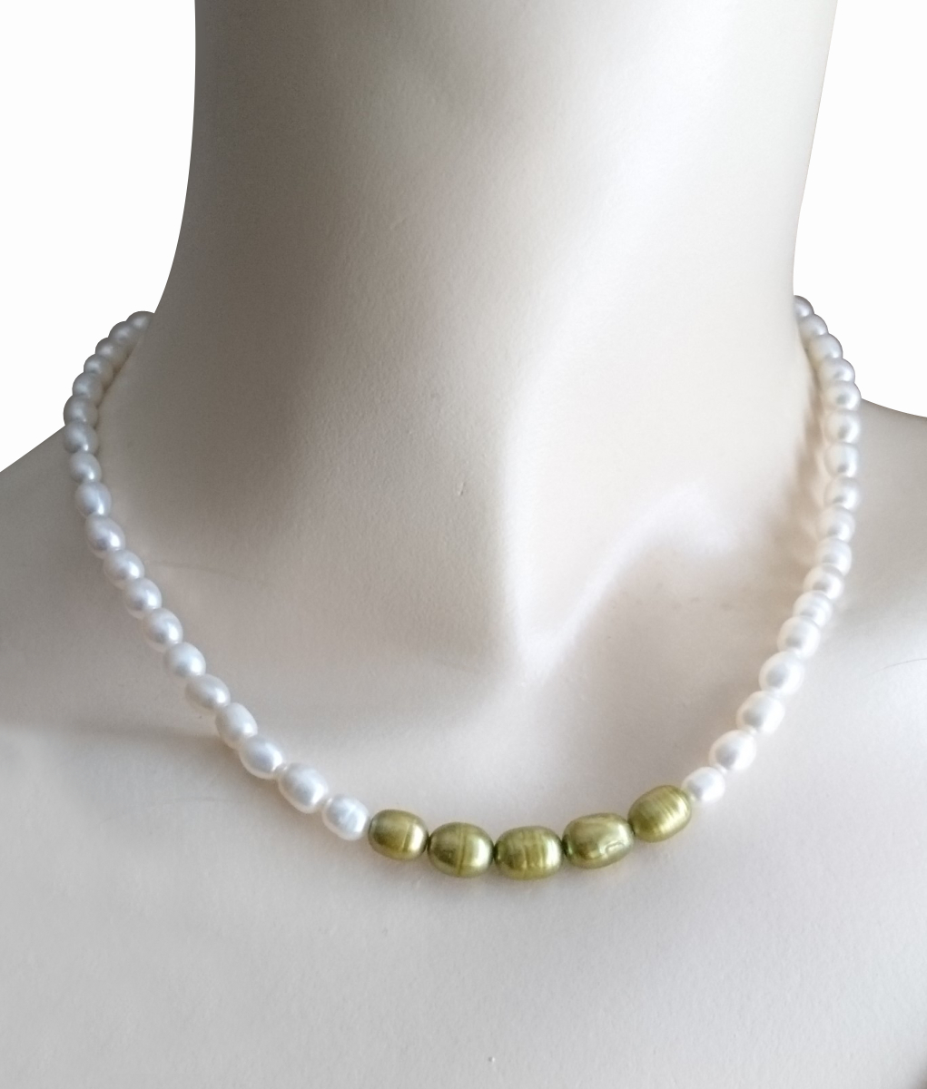 【送料無料】◆flower storm◆長さ43~48cm 6月誕生石 淡水真珠(パール) ライス型 約6×4mm、8×7mm バイカラーネックレス アジャスター付 ホワイト×カーキゴールド (パワーストーン ステンレス アクセサリー 日本製 ) [戻る]