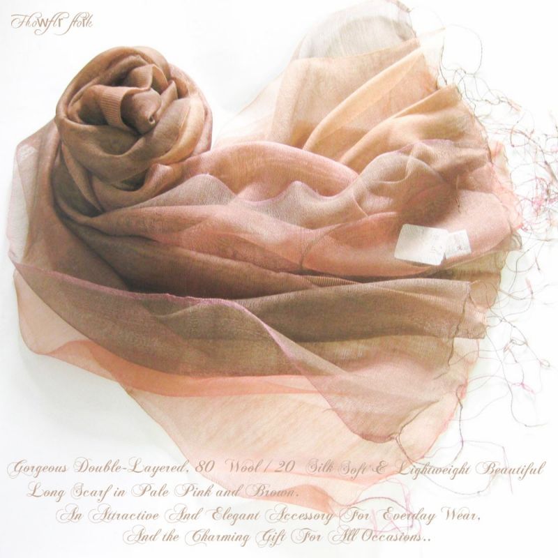 【薄手ストール】ウール混 2枚重ね大判ストール 淡く優しいピンクブラウン系 [181602]