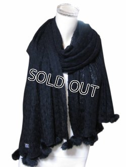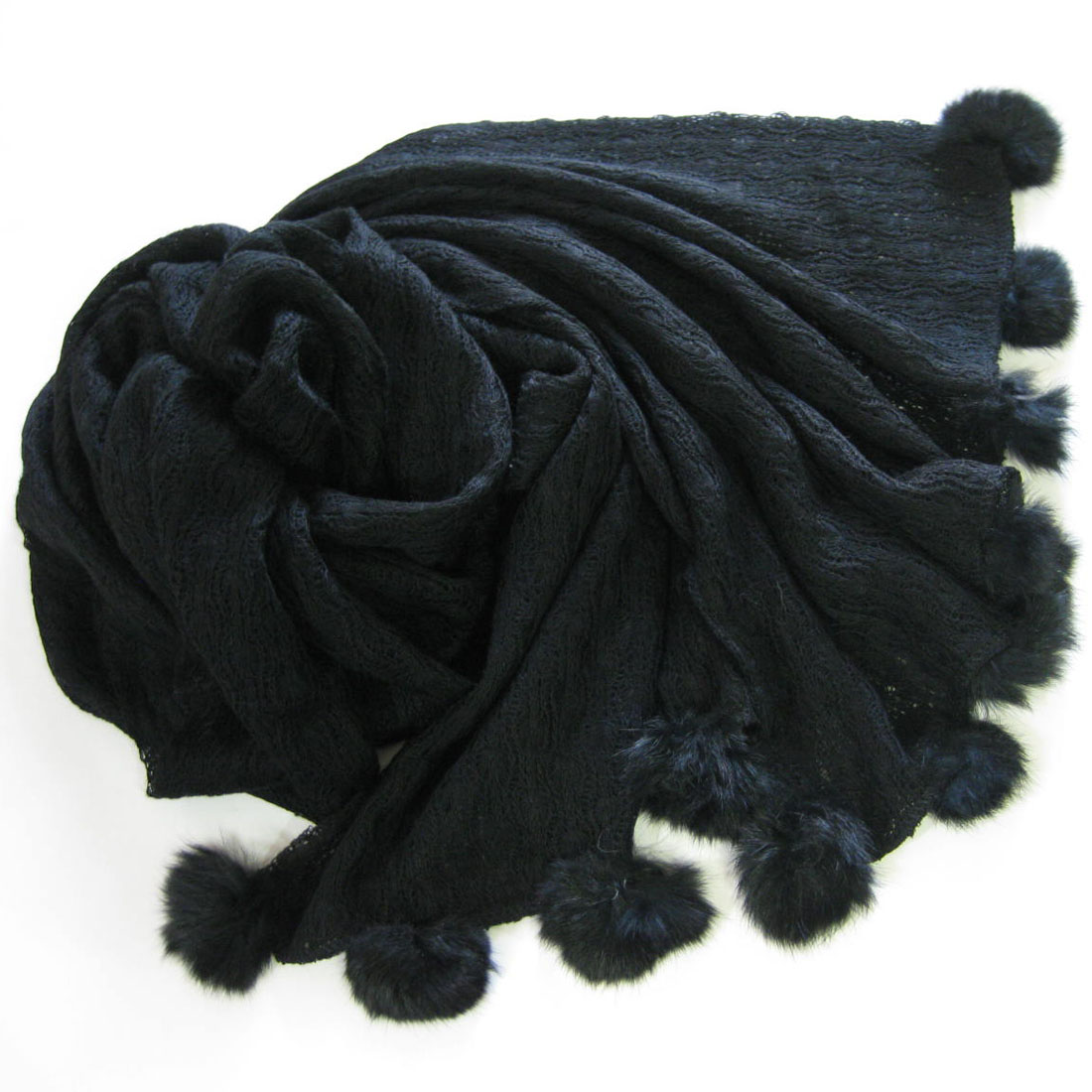 上品な透かし柄ニットの柔らかロングストール ミンクボンボンタッセル付 黒