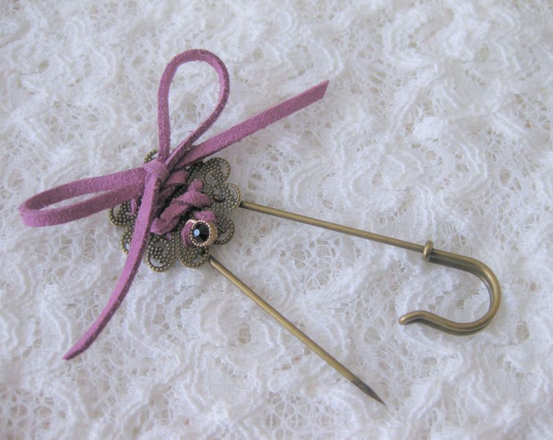 レザーリボン&クリスタルチャーム付き透かしフラワーデザインキルトピン