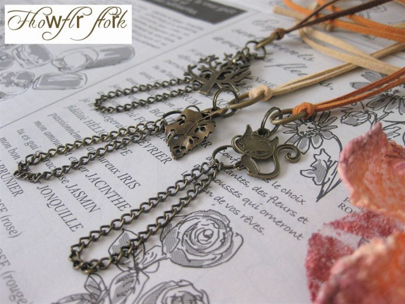 【送料無料】【レザーネックレス】◆flower storm◆ キュートなモチーフとチェーンタッセルのレザーネックレス アンティークブロンズ (革紐ロングネックレス メンズ/レディース) [1362799221]