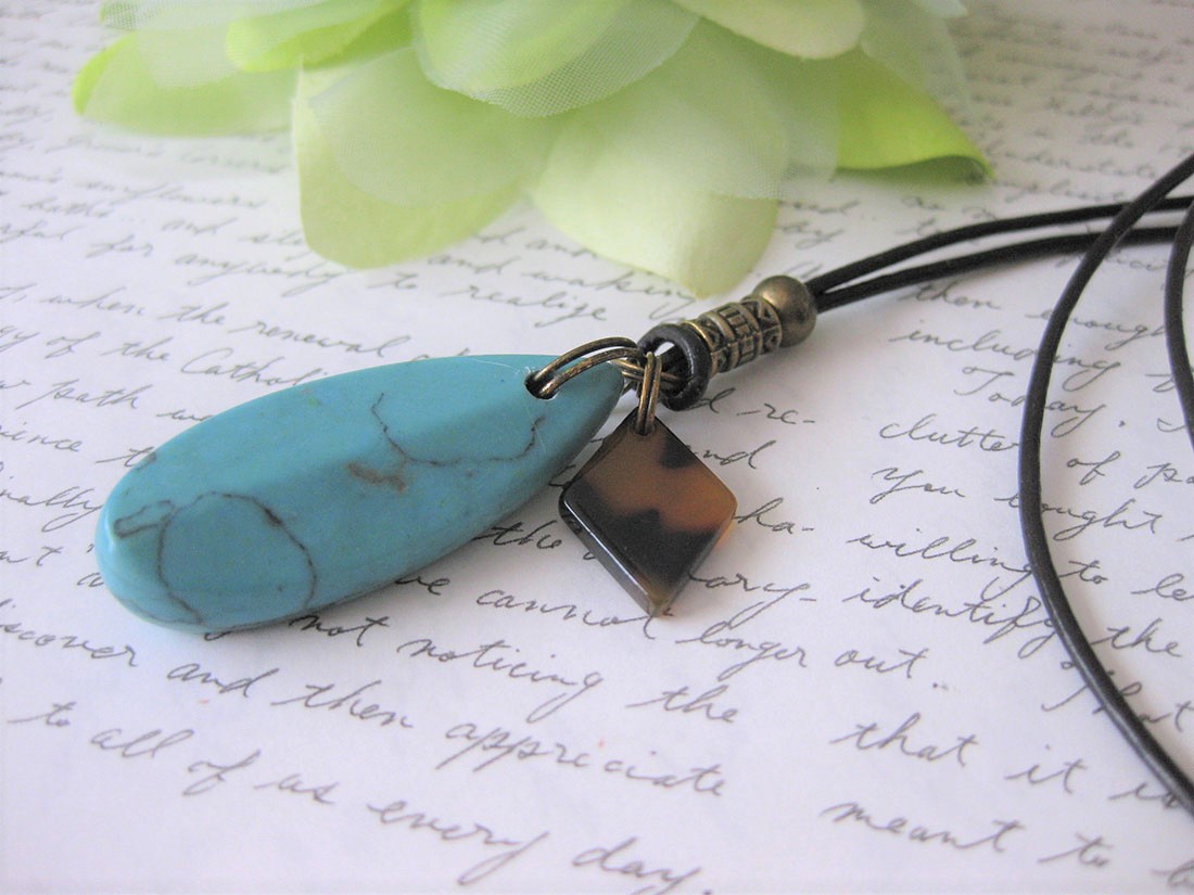 長さ約4cm 大きめターコイズブルー雫型ストーンの本牛革ネックレス