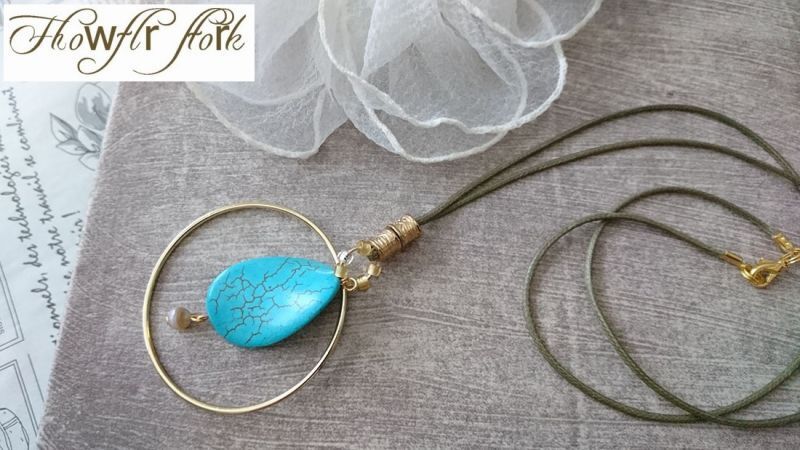 【送料無料】【ワックスコードネックレス】◆flower storm◆ 大きなターコイズとシェル、メタルリング使いのロングネックレス(天然石 トルコ石 貝 エスニック 12月誕生石 日本製) [1362799482]