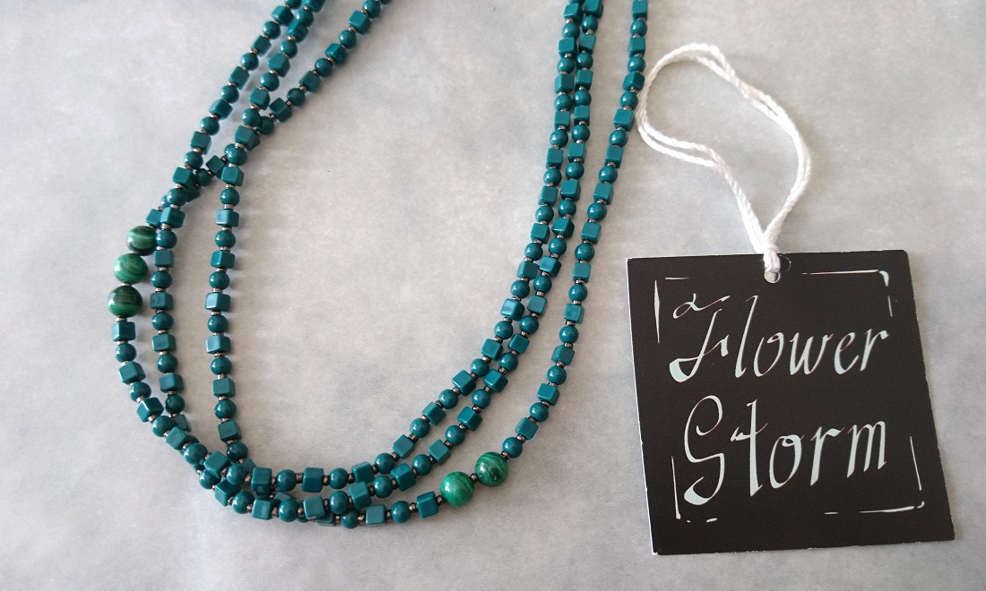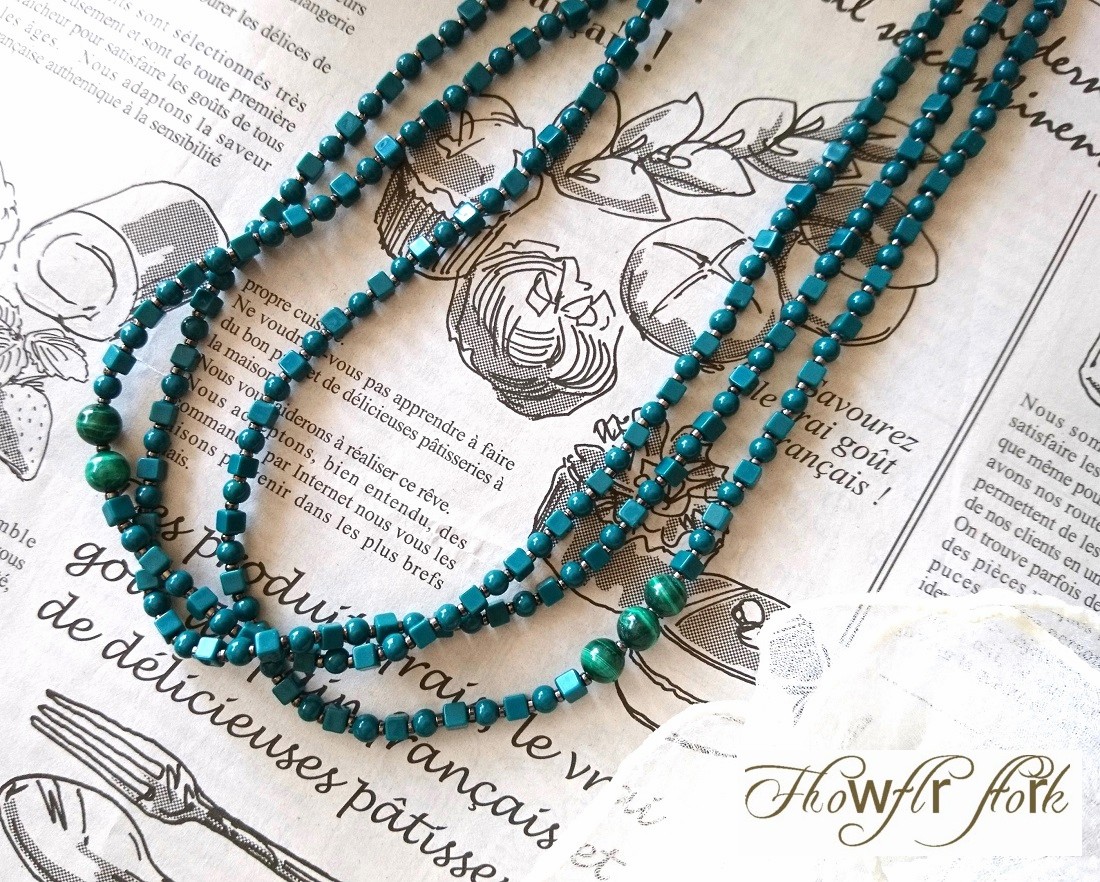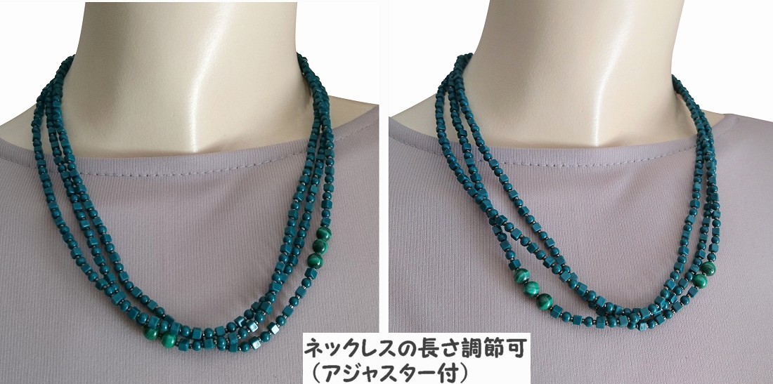 【送料無料】◆flower storm◆長さ51~56cm 天然石マラカイトと3種のビーズのティールカラー3連ネックレス アジャスター付 ( パワーストーン 孔雀石 アクリル TOHO 真鍮 ステンレス アクセサリー 日本製 レディース ) [1368799667]