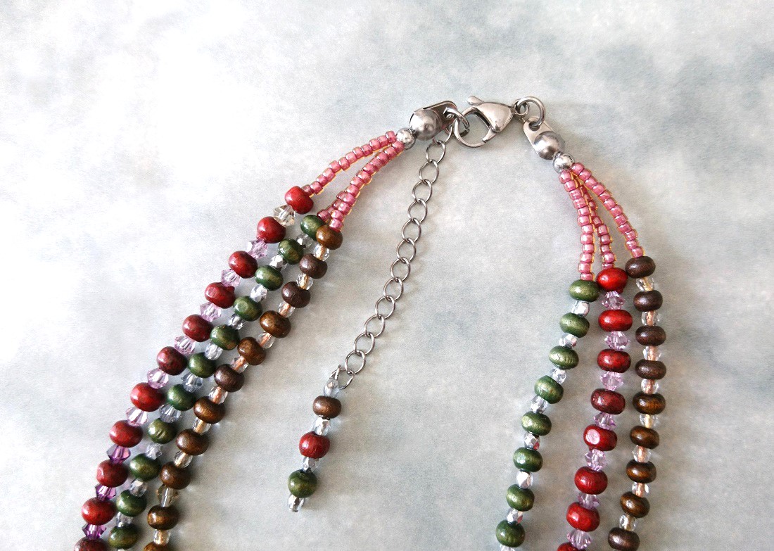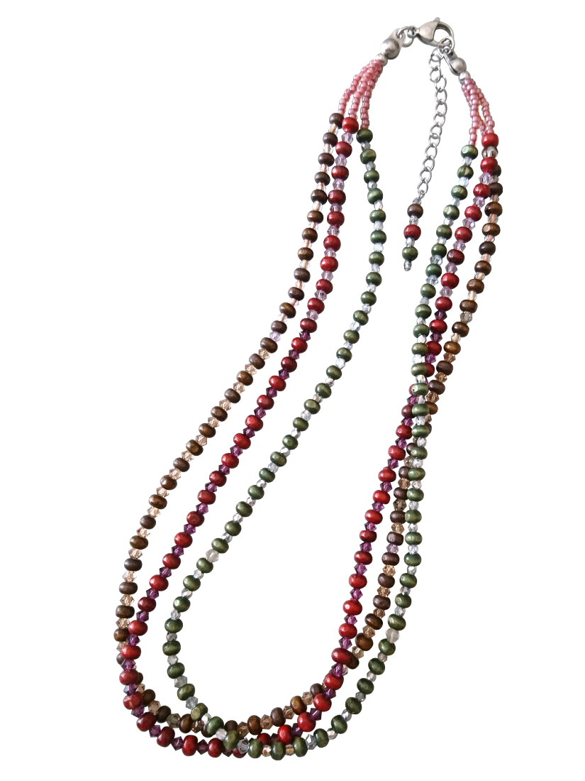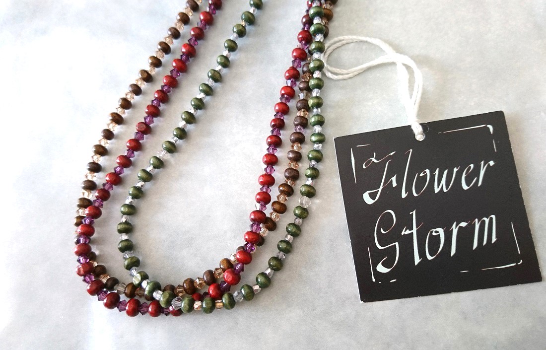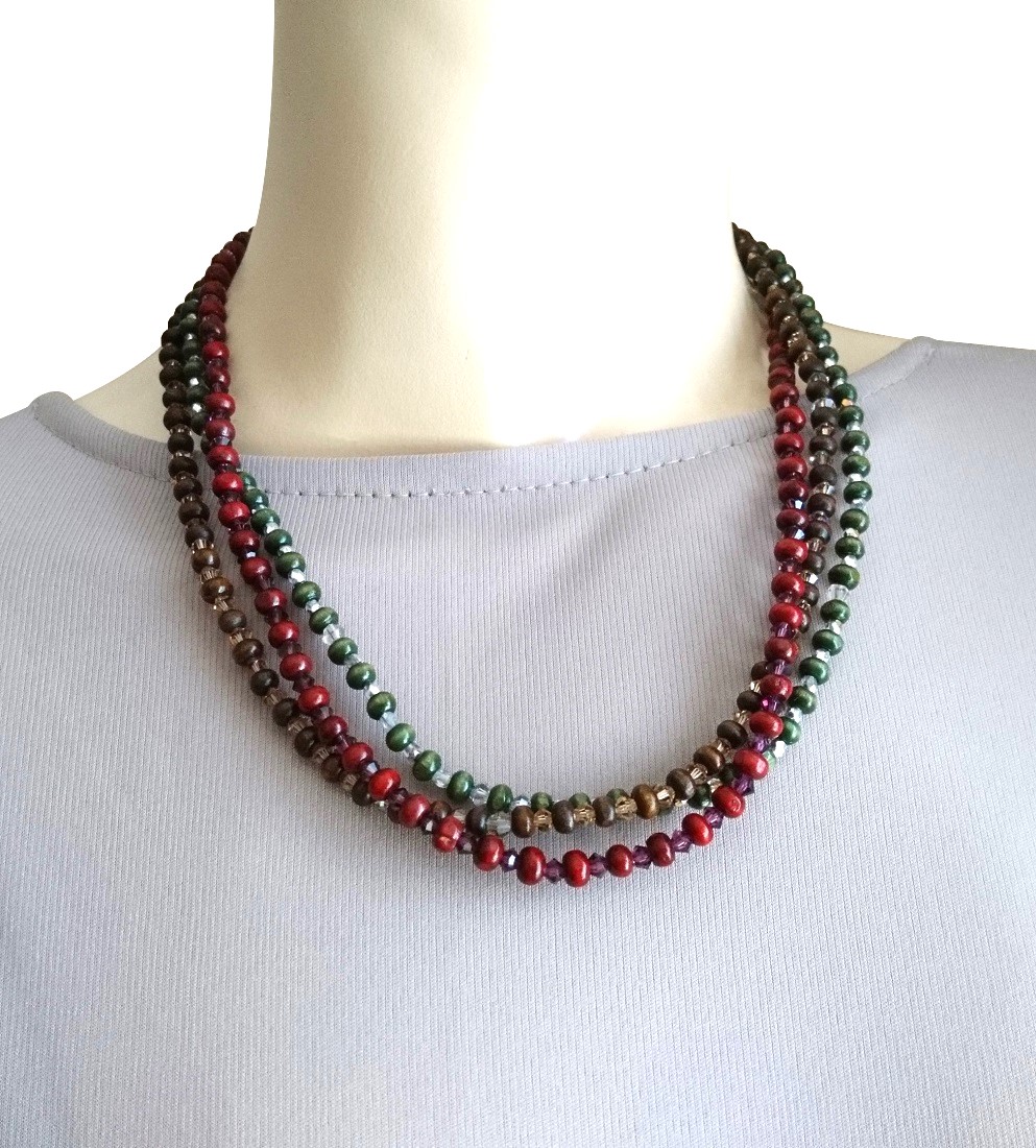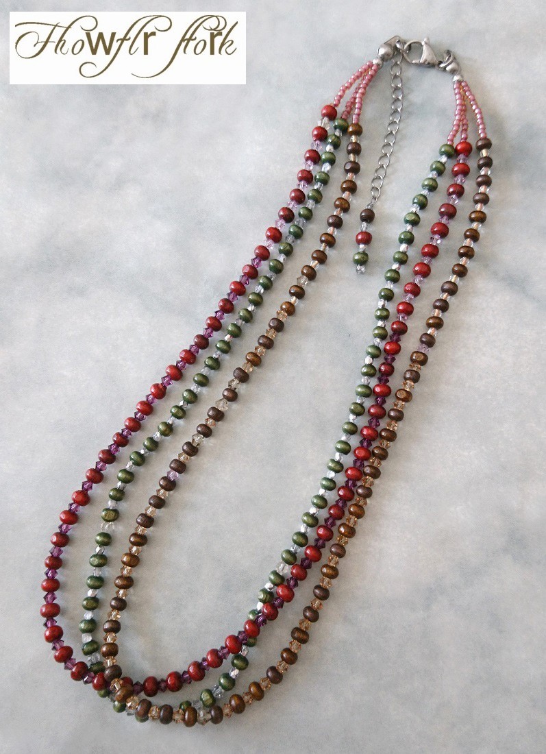 マルチカラー ウッド&スワロフスキービーズ3連ネックレス☆☆