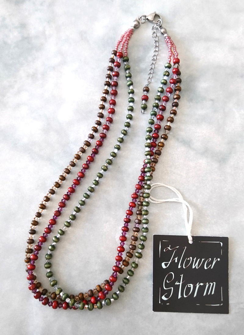 【送料無料】◆flower storm◆長さ51~56cm マルチカラー ウッド&スワロフスキービーズ3連ネックレス アジャスター付 (アクセサリー 木製 スワロ SWAROVSKI ラインストーン TOHOビーズ ステンレス 日本製 ) [1368799677]