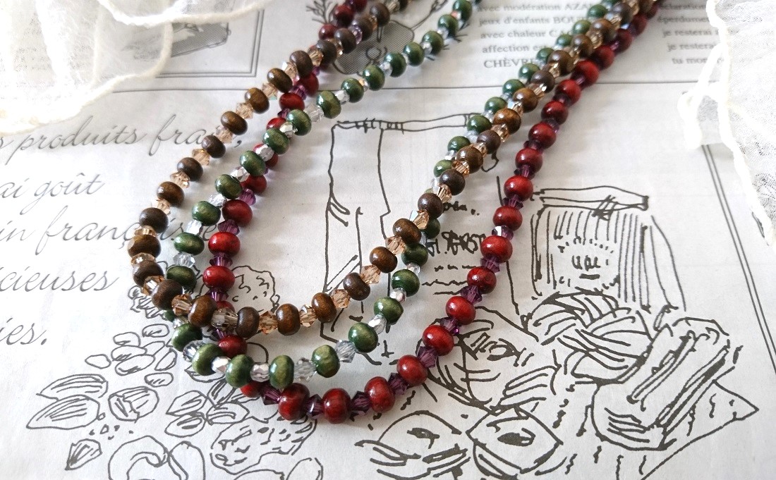 ■色(ウッドビーズ<レッド、グリーン、ブラウン>スワロフスキービーズ<
