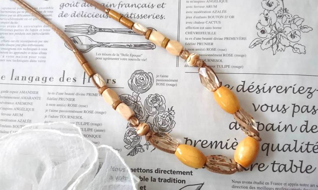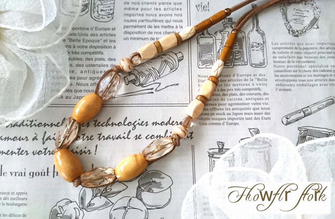 【送料無料】◆flower storm◆長さ約55cm ウッドとアクリル、水牛ビーズの 革紐ネックレス ライトマスタード×ブラウン(アクセサリー レザーネックレス 木製 樹脂 バッファローホーン 天然素材 日本製) [1368799679]