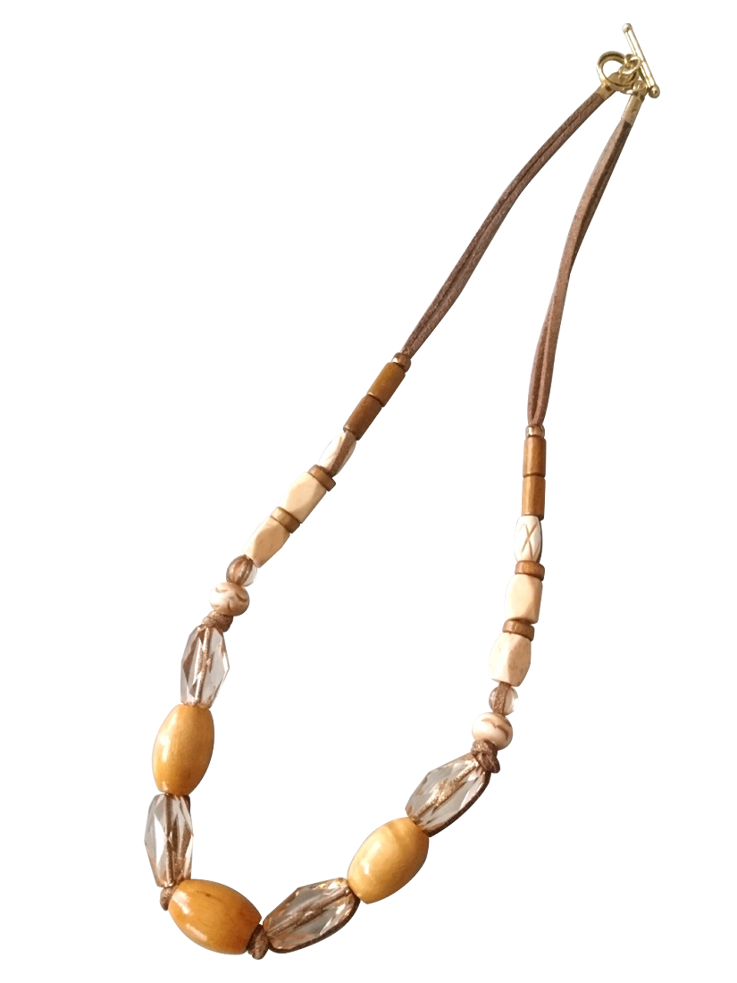 ウッドや水牛のナチュラル感と多面カット樹脂ビーズの透明な輝きがポイント♪